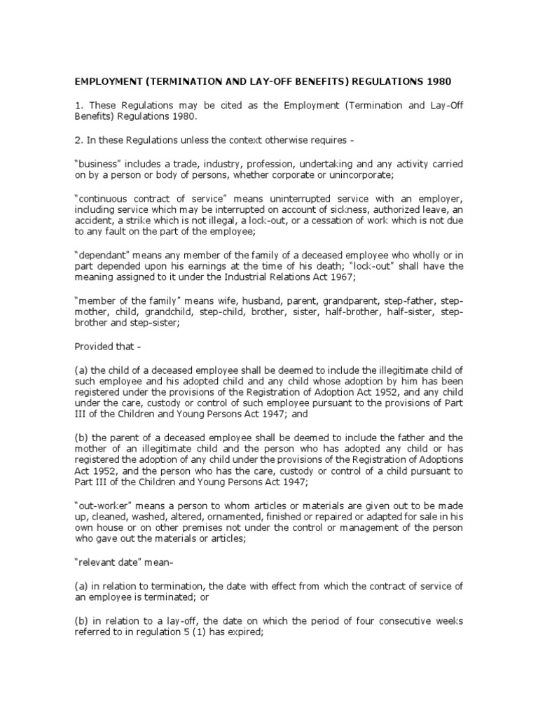Employment (Termination And Lay Off Benefits) Regulations Malaysia / The minimum requirements of of the contract.. A layoff is considered a termination of employment when the employer has no intention of recalling the employee to work. Employment security, termination of employment. Severance pay is payable where the termination is by way of retrenchment or upon closure of business. The minimum requirements of of the contract. Termination of employment or separation of employment is an employee's departure from a job and the end of an employee's duration with an employer.